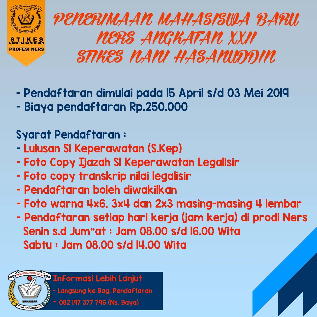 Untuk mengetahui jumlah biaya yang harus anda keluarkan untuk melakukan pembayaran biaya pendaftaran dan juga mengenai rincian biaya kuliah anda. Akun resmi stikes nani hasanuddin prodi >profesi ners >s1 keperawatan >s1 gizi Minat mahasiswa program studi s1 keperawatan untuk mengikuti program ners di stikes nani hasanuddin makassar. Jurusan di stikes nani hasanuddin. Program studi d iii farmasi stikes nani hasanuddin makassar diselenggarakan berdasarkan sk dirjen dikti no.